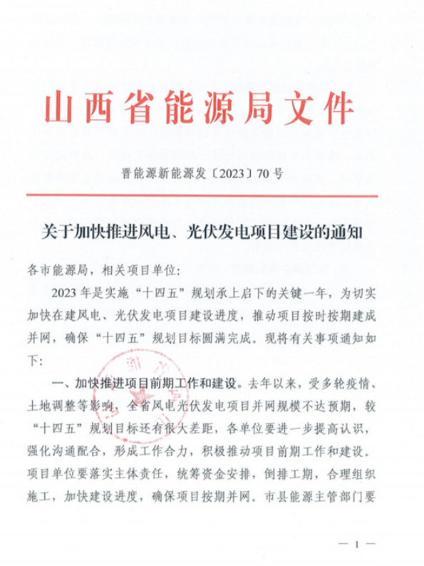 近日,山西省能源局發(fā)布《關(guān)于加快推進(jìn)風(fēng)電、光伏發(fā)電項(xiàng)目建設(shè)的通知》?!锻ㄖ分赋觯ツ暌詠?,受多輪疫情土地調(diào)整等影響,全省風(fēng)電光伏發(fā)電項(xiàng)目并網(wǎng)規(guī)模不達(dá)預(yù)期,較“十四五”規(guī)劃目標(biāo)還有很大差距,各單位要進(jìn)一步提高認(rèn)識(shí)強(qiáng)化溝通配合,形成工作合力,積極推動(dòng)項(xiàng)目前期工作和建設(shè)。項(xiàng)目單位要落實(shí)主體責(zé)任,統(tǒng)籌資金安排,倒排工期,合理組織施工,加快建設(shè)進(jìn)度,確保項(xiàng)目按期并網(wǎng)。市縣能源主管部門要加強(qiáng)對(duì)風(fēng)電、光伏發(fā)電項(xiàng)目管理,完善項(xiàng)目定期調(diào)度、進(jìn)度跟蹤和通報(bào)機(jī)制,督指導(dǎo)促項(xiàng)目單位盡快完善各項(xiàng)前期手續(xù)、加快推進(jìn)項(xiàng)目建設(shè)。