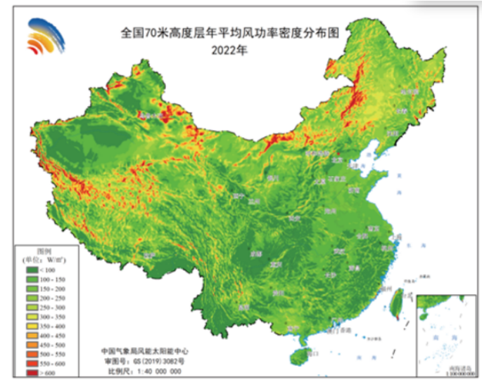 2022年全國70米高度層年平均風(fēng)功率密度分布(單位:瓦特/平方米)