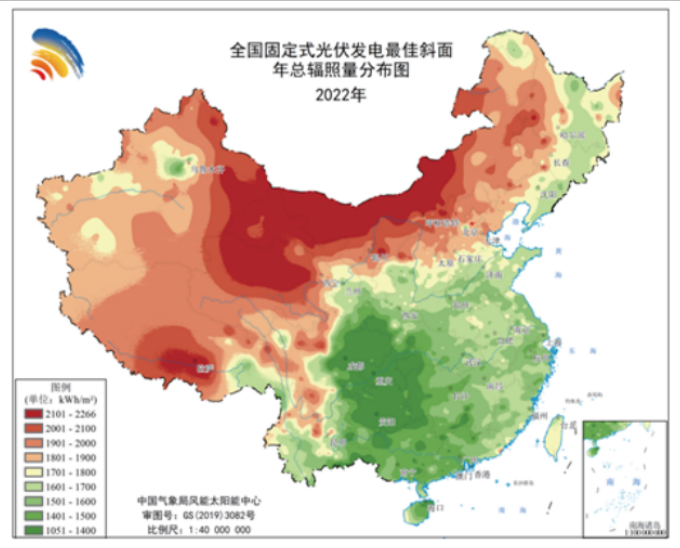 2022年,全國平均年水平面總輻照量約1563.4千瓦時(shí)/平方米。為近30年最高值,與近30年(1992至2021年)平均值相比偏大3%,較近10年平均值偏大3.6%,較2021年偏大4.7%。全國平均 光伏發(fā)電 年較佳斜面總輻照量約1815.8千瓦時(shí)/平方米,較近30年偏大2.3%,較近10年偏大2.9%,較2021年偏大3.8%。
