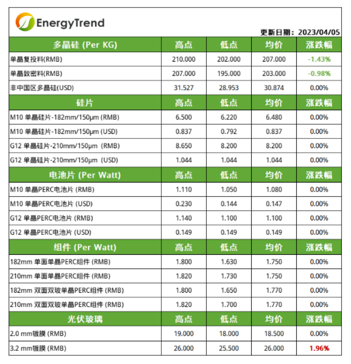 硅料延續(xù)緩跌態(tài)勢(shì) 組件價(jià)格有上漲預(yù)期(2023.4.6) 作者: 本站編輯 發(fā)布時(shí)間: 2023-04-06 來(lái)源: 本站