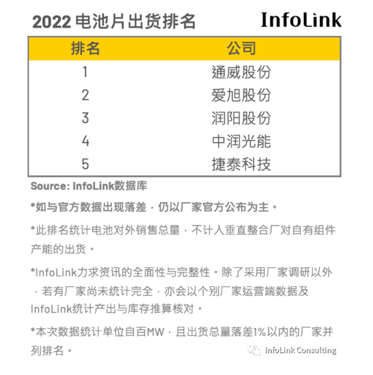 根據InfoLink調研,2022年電池片出貨排名仍舊以通威股份、愛旭股份、潤陽股份維持前三名的龍頭地位,接續(xù)排名對比2021年則有些許變化,中潤光能規(guī)劃的擴產陸續(xù)上線后在2022上半年出貨量爬升至第四名,捷泰也在本次榜單中重回前五名。
