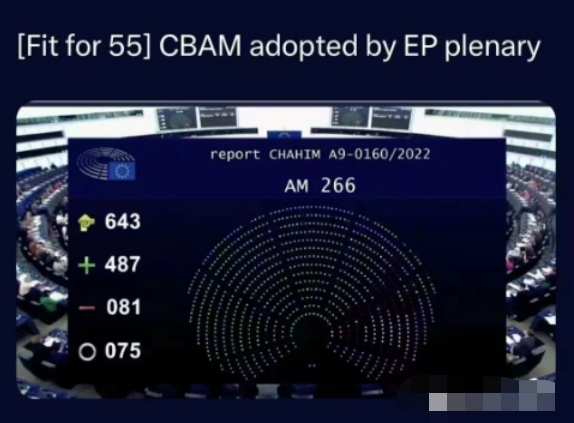 4月18日,歐洲議會批準了全面改革,批準了與成員國在 2022 年底就“ Fit-for -55”的幾項關(guān)鍵立法法案達成的協(xié)議。歐洲議會議員投票通過了包括碳邊界調(diào)整機制(CBAM)在內(nèi)的三項法案。