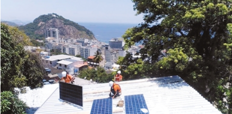 在巴西里約熱內(nèi)盧市一處居民樓,技術(shù)人員正在樓頂安裝太陽能光伏板。