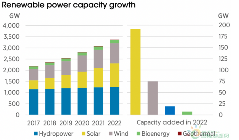 2022年,可再生能源發(fā)電裝機(jī)增加了295吉瓦(+9.6%)。太陽(yáng)能繼續(xù)引領(lǐng)裝機(jī)擴(kuò)張,大幅增長(zhǎng)192吉瓦(+22%),其次是風(fēng)能,增長(zhǎng)75吉瓦(+9%)。可再生水電容量增加了21吉瓦(+2%),生物能源容量增加了8吉瓦(+5%),地?zé)崮茉鲩L(zhǎng)了181MW。太陽(yáng)能和風(fēng)能加起來(lái)占2022年所有可再生能源凈新增量的90%。