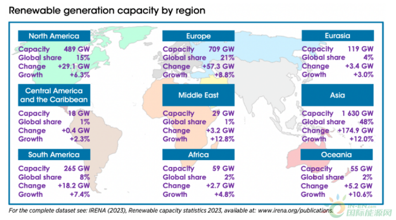 2022年亞洲地區(qū)占新增裝機(jī)容量的60%左右,增加174.9吉瓦,總計(jì)達(dá)到1630吉瓦(占全球總量的48%)。這一增長(zhǎng)的很大一部分發(fā)生在中國(guó)(+141吉瓦);歐洲和北美分別增長(zhǎng)了57.3吉瓦(+8.8%)和29.1吉瓦(+6.3%)。非洲繼續(xù)穩(wěn)步增長(zhǎng),增長(zhǎng)2.7吉瓦(+4.8%),略高于去年。大洋洲繼續(xù)保持兩位數(shù)的增長(zhǎng),增長(zhǎng)5.2吉瓦(+10.6%),這主要是得益于澳大利亞的擴(kuò)張。南美洲繼續(xù)呈上升趨勢(shì),新增裝機(jī)18.2吉瓦(+7.4%)。中東地區(qū)也創(chuàng)下了有記錄以來(lái)的最高擴(kuò)張,2022年新增3.2吉瓦(+12.8%)。