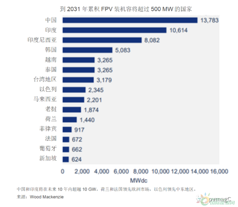 據(jù)預(yù)計(jì),到2031年將有15個(gè)國(guó)家的累計(jì)FPV裝機(jī)容量超過(guò)500 MW。中國(guó)、印度和印度尼西亞——共計(jì)占到2022年度近70%的FPV需求總量——預(yù)計(jì)仍將保持前列。