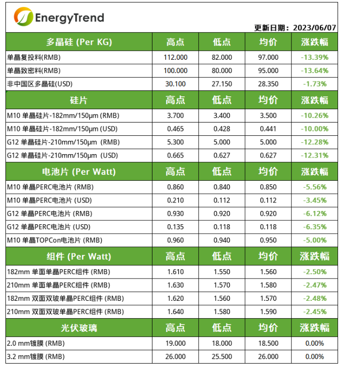 根據(jù)集邦咨詢旗下新能源研究中心集邦新能源網(wǎng)EnergyTrend最新報(bào)價(jià),光伏供應(yīng)鏈價(jià)格整體下跌。