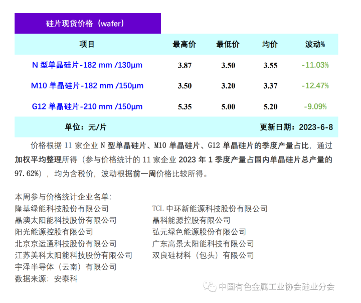 本周硅片價格持續(xù)下跌,N型單晶硅片(182 mm /130μm)成交均價為3.55元/片,周環(huán)比降幅11.03%;M10單晶硅片(182 mm /150μm)成交均價為3.5元/片,周環(huán)比降幅為12.47%;G12單晶硅片(210 mm/150μm)成交均價為5.2元/片,周環(huán)比降幅為9.09%。