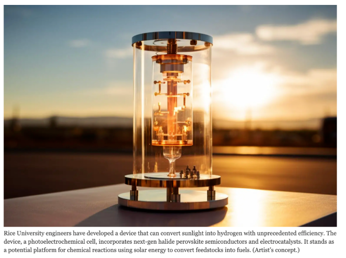 根據(jù)《自然通訊》報道,英國萊斯大學(xué)Aditya Mohite實驗室的工程師將鹵化物鈣鈦礦半導(dǎo)體與電催化劑結(jié)合在一個單一、耐用、成本效益高且可擴展的設(shè)備中,以破紀錄的20.8%效率將陽光轉(zhuǎn)化為氫氣。這項新技術(shù)是清潔能源向前邁出的重要一步,可以作為一個廣泛的化學(xué)反應(yīng)平臺,利用太陽能發(fā)電將原料轉(zhuǎn)化為燃料。