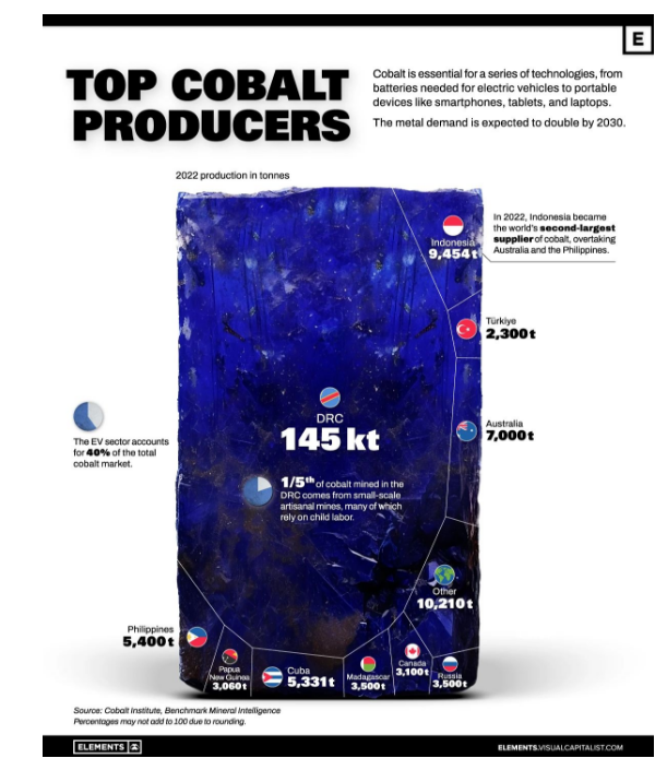 電動汽車行業(yè)是鈷的最大消費(fèi)行業(yè),約占總需求的40%。電動汽車行業(yè)的指數(shù)級增長預(yù)計將推動全球鈷需求到2030年翻一番,達(dá)到38.8萬噸。剛果民主共和國(剛果·金)長期以來一直是世界上最大的鈷生產(chǎn)國,2022年產(chǎn)量占全球產(chǎn)量的73%。今年以來鈷價格下跌了近30%,至每磅13.90美元,嚴(yán)重影響了剛果民主共和國的收入 .