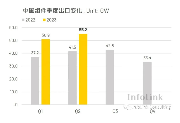 根據(jù)InfoLink中國海關(guān)數(shù)據(jù),6月份中國共出口18.08 GW的光伏組件,相較5月18.99 GW小幅減少5%。2023上半年總共累積出口106.1 GW,相較去年同期的78.7 GW增加35%,顯示上半年海外市場出現(xiàn)高速增長。