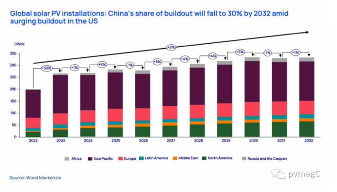 該研究機(jī)構(gòu)預(yù)測(cè)2024年全球太陽能市場(chǎng)將實(shí)現(xiàn)1%的同比擴(kuò)張,而后2025年將達(dá)到5%的增長(zhǎng)。然而,預(yù)計(jì)2026年可能發(fā)生1%的下降。很明顯,包括中國(guó)在內(nèi)的亞太地區(qū)將在2032年前在光伏部署市場(chǎng)占主導(dǎo)地位。